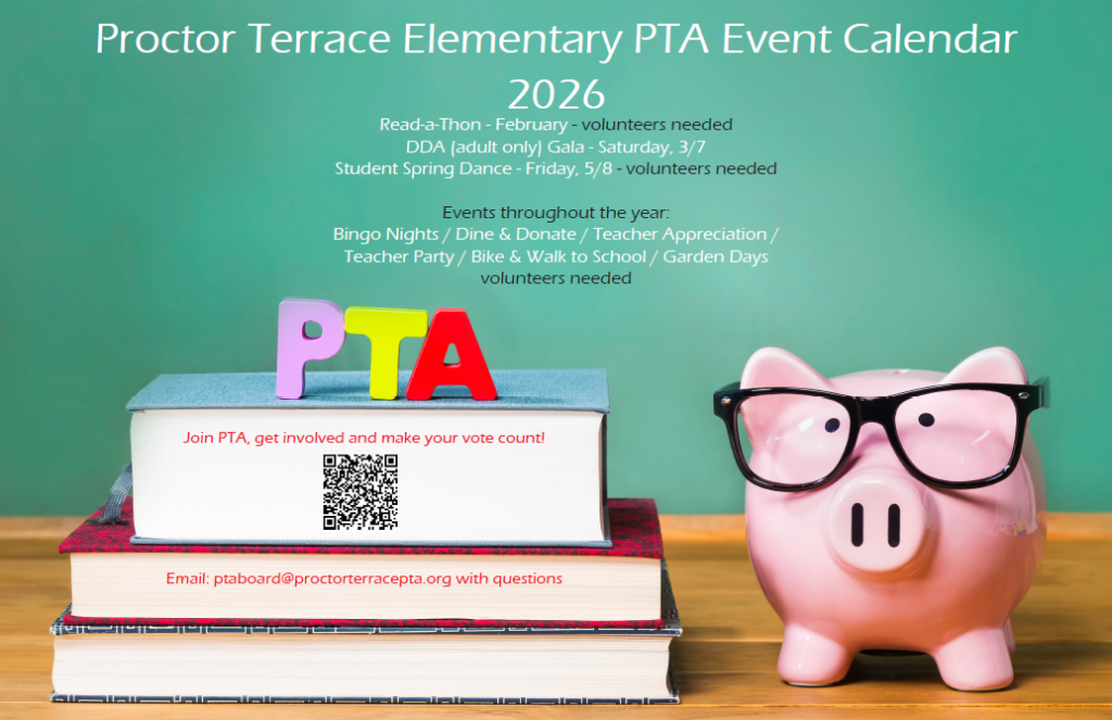 Never miss a thing! Subscribe to the Proctor Terrace PTA calendar and important dates and events will be added to your personal calendar.